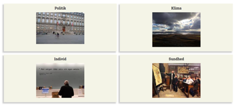 Den studerende kan fx begynde i Ressourcerummet for at lade sig inspirere til et emne. Hvad undrer mig i den aktuelle debat? Hvad interesserer mig? Vil jeg trække på naturvidenskabelige faglighed (Vælg: Klima eller Sundhed), eller vil jeg i højere grad trække på samfundsfaglig og humanistisk faglighed (Vælg: Politik eller Individ)?