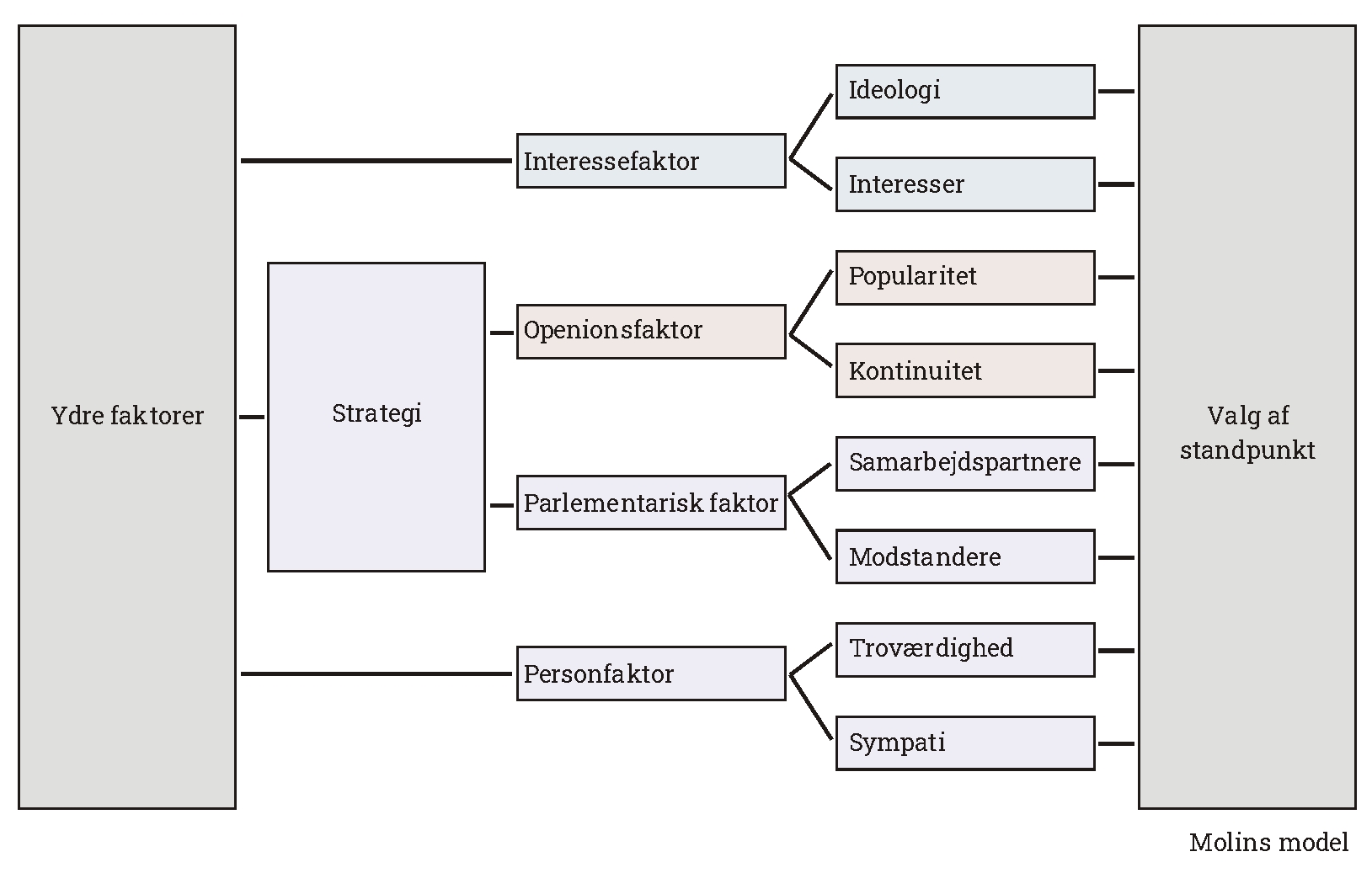 Den svenske politolog Björn Molin (1932-) har udarbejdet en model, der kan bruges til at forklare politiske partiers standpunkt. Ifølge Molin kan et partis valg af standpunkt forklares ud fra interessefaktor, opinionsfaktor, parlamentarisk faktor og personfaktor.