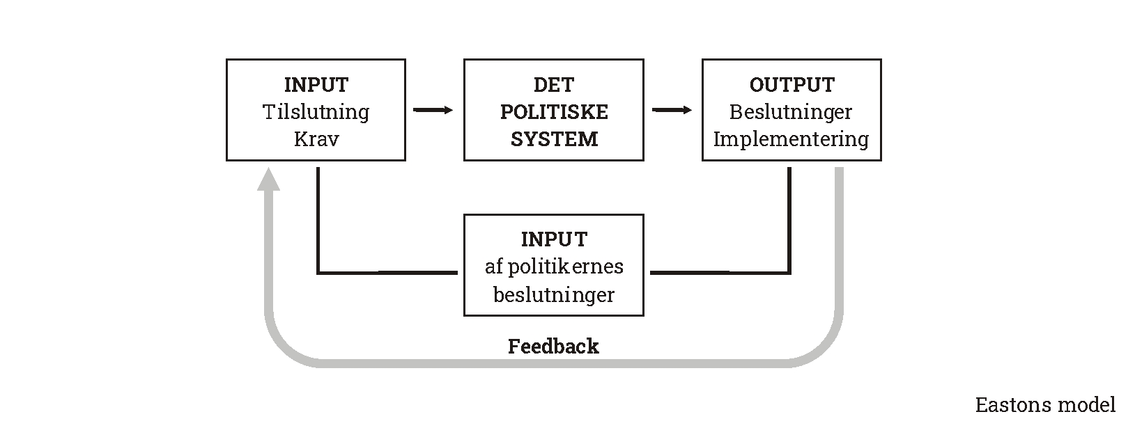 Borgere, interesseorganisationer, virksomheder, medier mm. retter krav og støtte mod det politiske system, som omsætter input til output i form af lovgivning og beslutninger, som rettes mod det omgivende samfund.