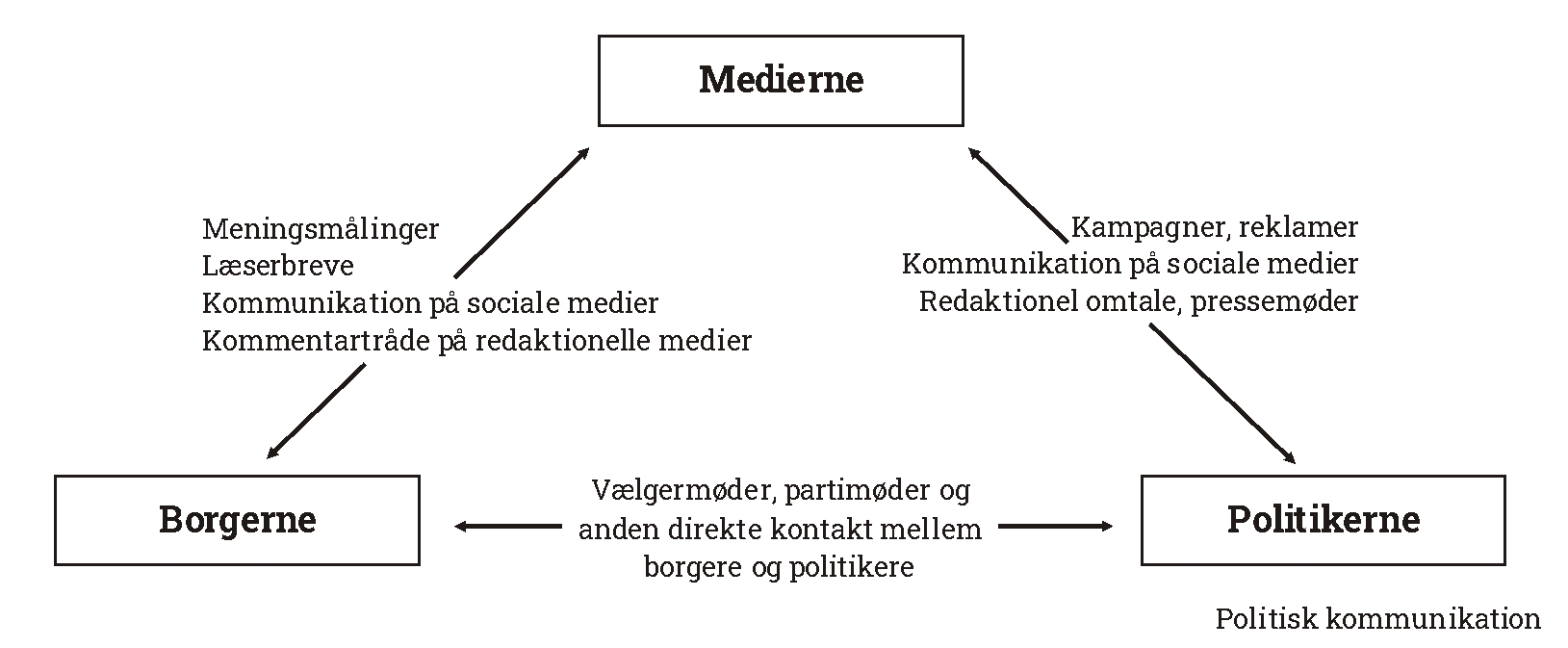Politisk kommunikation foregår i en triangel mellem borgere (den del af befolkningen, der ikke er politikere), politikere (den del af borgerne, der er politikere) og medierne. Både borgere og politikere anvender medierne som kommunikative redskaber. Det sker langt hyppigere end det traditionelle direkte møde mellem borgere og politikere.